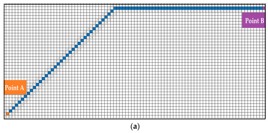 The A* algorithm originates from the Dijkstra algorithm and is a classical and efficient heuristic algorithm. The A* algorithm searches by node and expands by 8 nodes, 24 nodes, etc. In this study, raster coordinate mapping was used as the search map, so eight-node expansion was selected to improve the computational efficiency. Formula (1) is its evaluation function [43,44,45].