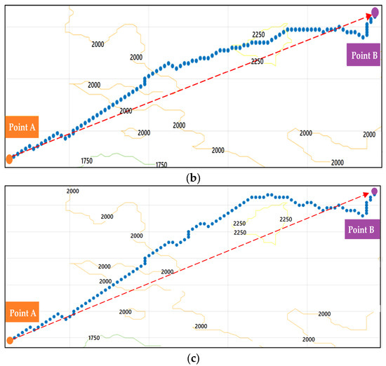 This section discusses the effect of terrain factors on path planning results with the improved A* algorithm. In Figure 9, for medium vehicles, three kinds of path planning results (A→B) are obtained by using different forms of the A* algorithm (traditional A*, including land cover but not terrain, and including land cover and terrain). Figure 9a shows the path planning results of the traditional A* algorithm for two points, A and B, in the plane model. In the 3D model, the planned path in Figure 9b crosses the 2250 m contour line, while the planned path in Figure 9c can bypass the area with steep terrain.