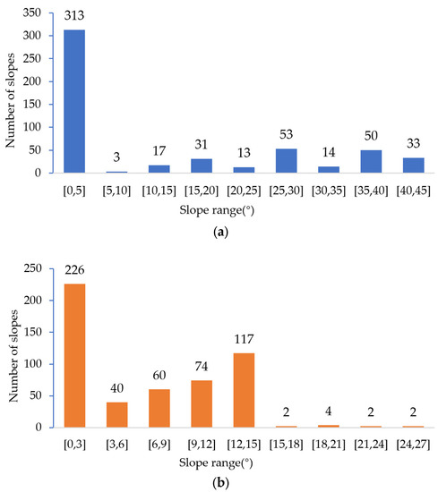 According to the B→D path marked in Figure 12a,b, the slope angles in the driving direction of a medium vehicle and a large vehicle are presented in Figure 13a,b, respectively. For medium vehicles, the proportion of slope angles in the range [0°,5°] is 59.4%, and the distribution is relatively uniform in the range [5°,45°]. For large vehicles, slope angles in the [0°,3°] range account for 42.9%, and those in the [3°,15°] range account for 55.2%. The result of the two paths corresponds to the reality that the slope threshold and climbing ability of large vehicles are lower than those of medium vehicles.