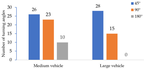 According to the bend statistics for turning conditions (Figure 14), there were 59 bends for a medium vehicle and 43 bends for a large vehicle. Concretely, the proportions of 45° and 90° turning angles were 44.07% and 38.98%, respectively, for the medium vehicle, while they were 65.12% and 34.88%, respectively, for the large vehicle. Due to the large structure and wheelbase, large vehicles need stricter turning conditions.