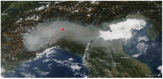 The area of interest is focused in Lombardy, located in the North of Italy which is considered a pollution hotspot due to the physical features of this area (Figure 3). Specific topographic components such as the Alps’ in the north and west of the region and the Apennines’ presence in the south cause the wind to be entrapped in the Po Valley. Thermal inversions on a regular basis hinder the proper dispersion of air pollutants [27]. We concentrate on the air quality in the metropolitan city of Milan. This choice was made because Milan is a traffic-intensive and industrial area.