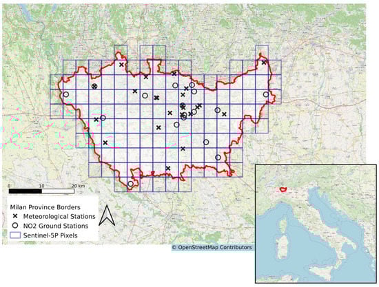 Location of NO and meteorological ground sensors belonging to ARPA Lombardia alongside Sentinel-5P pixel grid [30].