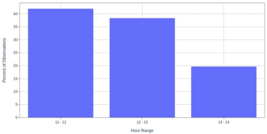 Sentinel-5P was the chosen NO satellite to train the model. Although other satellites, OMI from the National Aeronautics and Space Administration (NASA), provide NO measurements, Sentinel-5P has a resolution of 5.5 × 3.5 km compared to 13 × 24 km of OMI [32]. Both Sentinel-5P and OMI have a daily temporal resolution. The daily satellite passage over the Metropolitan City of Milan is variable, but it is always in the time range between 11:00 and 14:00 UTM+0 (Figure 5).