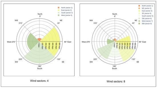 Wind direction data required further processing with respect to the rest of the meteorological data. Given that wind direction is originally delivered in degrees, this measure cannot be simply averaged for the satellite passage time. Doing so would lead to a wind direction result that is not true for that period. For this reason, we decomposed the wind direction into north and east vectors and multiplied them by the wind speed. When calculating the mean of this measure, we are considering the wind strength (velocity) to weigh the average over a period of time. This operation was performed both for the satellite passage time and for the 21 h period prior to the passage time. After obtaining this average, the measurement was transformed back to wind direction in degrees. For model training purposes, we classified wind direction into four and eight sectors (Figure 8) independently. The comparison of these two classifications will be further described in Section 2.7.2.