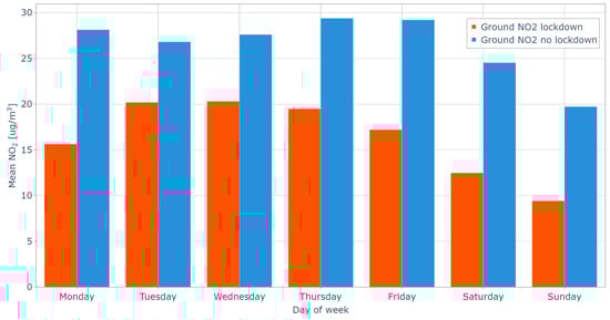 The time span used for this work (1 January 2019 to 28 September 2022) comprises data from the COVID-19 pandemic, pre-pandemic and post-pandemic periods. The COVID-19 pandemic period represents the abnormal behaviour of people’s transportation dynamics due to lockdown restrictions that were in place in Italy (9 March 2020 to 3 May 2020). Average NO concentrations at the time of passage of the satellite declined for each day of the week during the lockdown period compared to the same period in 2021 (Figure 9) and 2019 [53]. Google Mobility data (https://www.google.com/covid19/mobility/, (accessed on 20 October 2022)) report the percentage change in people’s movements during the COVID-19 lockdown period compared to a previous period where no lockdown was present [54]. By using this data, we can attribute that the decline in people’s mobility was caused by the transportation restrictions imposed by local authorities.