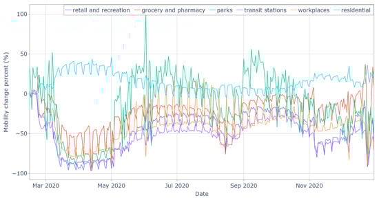 The percentage decrease in Google mobility data (Figure 10) is calculated with respect to a baseline period before the pandemic outbreak. The baseline days are determined as the median value throughout the five-week period from 3 January to 6 February 2020. They indicate the normal value for that day of the week [54].
