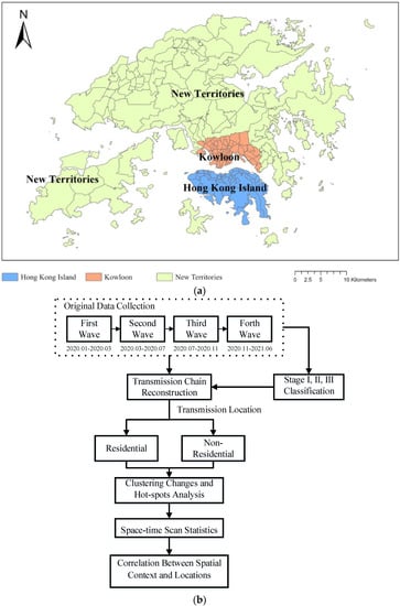 (a) TPU scale map of hong kong in the study area. (b) Data acquisition and analysis process. (c) Weekly case statistics among different waves.