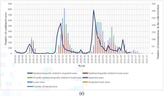 Figure 1c also shows the weekly statistics of the number of confirmed cases during the four different waves, as well as the statistics of the number of transmissions with transmission chain information obtained according to preprocessing. During this period, there were 11,842 confirmed cases and, after preprocessing, 2417 cases that could build transmission chains were obtained. The results showed that the changing trend of the transmission chain data was consistent with the changing trend of confirmed cases. It shows that the collected transmission data are still representative of the time, that is, the sampling in different stages of the case is relatively uniform. The time in the transmission chain data is the time when a case was infected with COVID-19, not the time of diagnosis, so the trend change of the line chart is slightly earlier than that of the histogram of all cases.