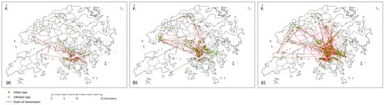 In the above studies on the space–time distribution of COVID-19 and the affecting factors, the distribution of COVID-19 has been represented by locations resided in or visited by COVID-19 cases, but not the transmission locations, that is, the locations where the infectors transmitted the virus to the now carriers. By reconstructing the transmission chains of COVID-19 and inferring the actual times and locations of the infections, more accurate space–time characteristics of COVID-19 transmission can be obtained. There have been studies on the information collected through enhanced on-site investigations (such as contact tracing) that can directly determine the transmission chain [16,17,18]. It is more common to infer the transmission chain by defining the probability of each epidemiological link, which depends on the space and time intervals between infections [19,20,21,22]. So far, few scholarly works have used the reconstructed transmission chain to prove the clustering and super-transmission potential of COVID-19 [23]. Another study also determined the effectiveness of Singapore’s epidemic prevention measures based on the transmission chains of COVID-19, highlighting the importance of social distancing and the detection of positive cases [24].