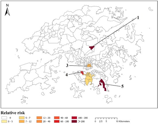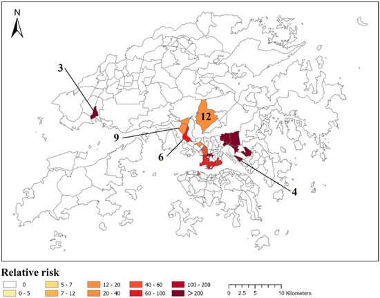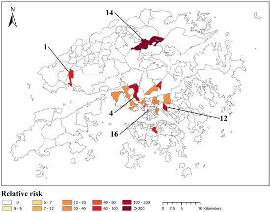 In this stage of the pandemic, most of the detected clusters were located in Kowloon and the New Territories. Whiles only one cluster was located on Hong Kong Island, eight clusters with eight TPUs were found in the New Territories. The relative risks ranged from 21.93 to 258.38, of which cluster 14 with the highest risk occurred at Wai Tau Tsuen, where the outbreak was caused by a case from this cluster that had visited Mui Wo Staycation and returned to Wai Tau Tsuen, resulting in multiple infections. The remaining six clusters, including a total of 14 TPUs, were in the Kowloon area, with a relative risk of 14.69 to 100.94. The cluster with the highest risk value in the Kowloon area was cluster 16, with a relative risk of 173.11, which includes the dormitories of the Lai King Disciplined Services Quarters and cases of bars and bands.