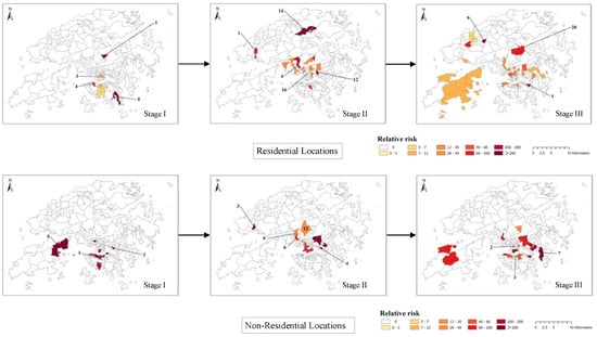 The results show that, in stage I of non-residential COVID-19 transmission, there were eight important clusters, and the detected clusters were mainly distributed within entertainment venues or commercial centers in the higher-income areas. The area with the highest relative risk value on Hong Kong Island was located near North Point. Two infection clusters occurred in this area from 25 January to 8 February. Cluster 1 was located near Wan Chai, a gathering place for entertainment and dining venues, where there had been multiple outbreaks. The highest relative risk was cluster 3, from 25 January to 26 January—a cluster of family transmissions occurred in this area. There was only one cluster located in the New Territories, due to a wedding banquet group at the Hong Kong Discovery Bay Hotel, with a relative risk of 381.70.