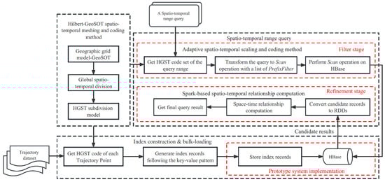 Figure 1 depicts an overview of the proposed method. We designed a key-value-based index model for each trajectory point. The main idea of the index model is to use our proposed Hilbert-GeoSOT spatio-temporal (HGST) meshing and coding as the prefix of the keywords. In this way, the spatio-temporal proximity of trajectory data in 3D space is preserved. To solve the problem of low query efficiency caused by the imbalance of time and space dimension scales in spatio-temporal range queries. We propose an adaptive spatio-temporal scaling and coding method. This method generates the query codes at a suitable subdivision level, which is determined by the time and space scope of the query. After that, a query code merging strategy is proposed to reduce the complexity of spatio-temporal range queries.