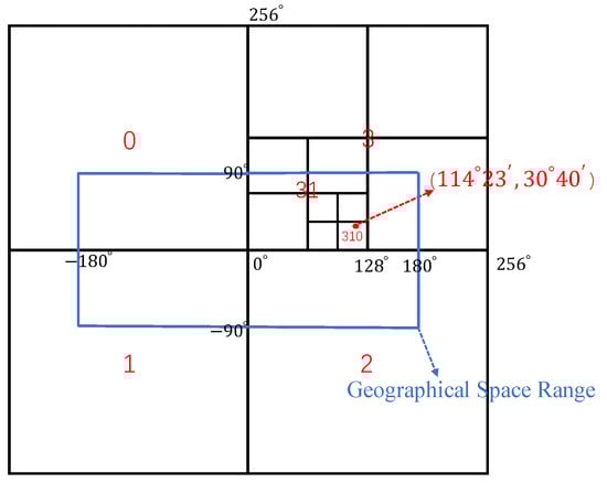 GeoSOT takes the intersection of the prime meridian and the equator as the central point, and recursively divides the earth’s surface into four grid cells. The GeoSOT global subdivision model is a spatial indexing model based on spatial partitioning [45]. The core idea of the model is to logically expand the geographical space three times. First, the original surface space is expanded from × to × ; then, is expanded from to , and finally, is expanded from to . Since it ensures the division of whole degrees, minutes, and seconds, the result is a one-dimensional integral grid code on the tree [46].