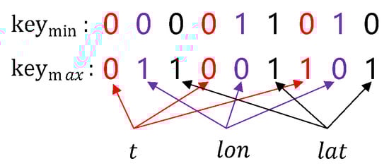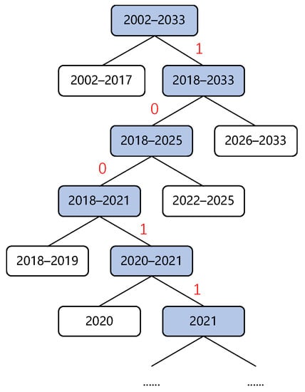 According to the above, the time dimension encoding is composed of and . The calculation of is shown in Figure 3. The root node of the tree represents the divided zone, a certain subdivision period (e.g., 2002∼2033); we recursively divide the node into two equal-sized child nodes. The binary bit is then assigned: if the position is on the left, assign 0; otherwise, assign 1. For example, at the moment of 20 August 2021 08:05:00, the time dimension code at the 9th level is 1-100111000 (“-” means a concatenation operation).