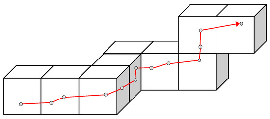 Firstly, note that the HGSTCode represents a spatio-temporal cube, which can identify a specific space–time scope . We then maintain an index for the track points in that belong to the same track; when the tracked moving object generates a new track point that “exceeds” , a new index is added for the point. The size of can be customized according to the required resolution, and if is small enough, it can accurately describe the motion state of a trajectory. Figure 6 is a schematic of our indexing method. With this approach, we first create the 3D grid-based spatio-temporal index, and then incrementally add data without causing any change to the index structure.