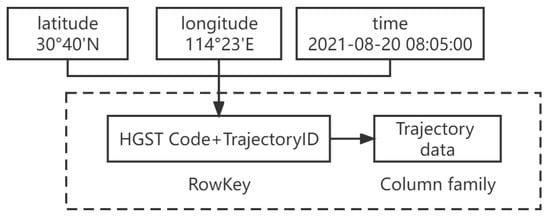 The indexing records are organized following the key-value model. The key is a combination of the HGSTCode of the trajectory point and the unique identifier UUID. The value is other attribute information of the trajectory point (e.g., TrajectoryID, longitude, latitude, timestamp, speed, and direction). The HGSTCode is used as the prefix to preserve the spatio-temporal proximity. That is, adjacent trajectory points in 3D space are stored adjacently in the physical location. Thus, the spatio-temporal range query performance is improved due to the number of disks seeking operations reduced. In this paper, we choose HBase, a famous key-value-based distributed storage system based on HDFS (Hadoop Distributed File System) [48], as the prototype of our storage system for spatio-temporal indexing records.