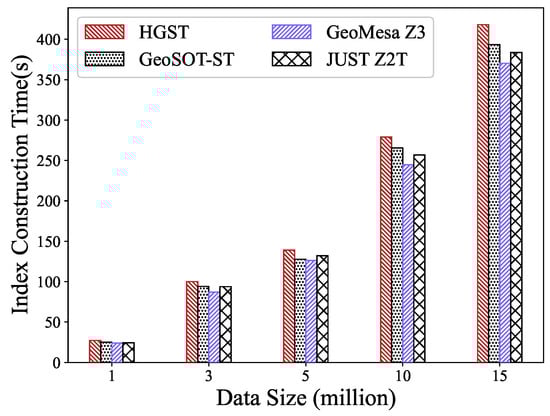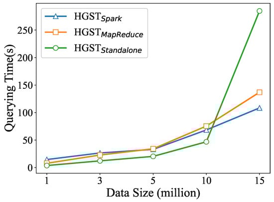 In the refinement stage of the trajectory spatio-temporal range query, based on Spark’s RDD programming paradigm, we take the results scanned from HBase as input to filter and save the results. To discuss the effect of using Spark to complete the spatio-temporal range query, we conduct an ablation experiment to compare the performance of the following three variants. (1) HGST; (2) HGST, which differs from HGST in that it uses MapReduce paradigm to accomplish functions similar to Spark; and (3) HGST, which only uses the client to collect the results from HBase and perform subsequent spatio-temporal relationship filtering. We set the time window to 3D and the spatial window to , and then carried out spatio-temporal range queries of different data sizes.