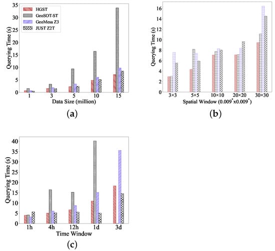 Different Data Sizes. Figure 12a shows the query efficiency varies with different data sizes of the T-Drive dataset. There are three observations: (1) with more data, the time of spatio-temporal query becomes longer for all methods, because it scans and returns more data; (2) with the increase in data volume, the query time consumption of GeoSOT-ST grows rapidly. The reason is that GeoSOT-ST, with the parameters set in this experiment (the time window is 4 h, and the spatial window is ), is a query with unbalanced spatial and temporal scales (i.e., a long time and small area query). As shown in Figure 13, GeoSOT-ST determines the index level according to the time range of the query, which results in returning too much “fake data”, so a lot of spatio-temporal relationship calculations need to be performed in the refinement stage; (3) HGST is faster than other methods, because the adaptive spatio-temporal scaling and coding method based on HGST avoids the invalid spatial filtering caused by the difference in scale between spatial and temporal dimensions; although Z2T indexes the time dimension and the spatial dimension separately to solve this problem, it is not good at spatio-temporal range queries with a smaller time period; (4) the time consumption of HGST increases slower, and when the amount of data increases by one order of magnitude, the query time remains stable compared with other methods, which demonstrates that HGST has better scalability under different data amounts.