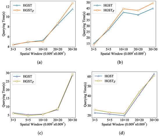 Figure 15 shows the effect of Hilbert filling curves on spatio-temporal range queries. We observe that (1) HGST mostly takes less time as the spatial extent increases. The reason is that the Hilbert curve has better aggregation than the Z-Order curve, which can usually make the trajectory points that are close in space have good proximity in physical storage. This is likely to go through less random disk IO when reading data; therefore, the more data returned, the more time will be saved. (2) The increase in the time window will enlarge the gap between HGST and HGST, and HGST is better in most cases. This demonstrates that our adoption of the Hilbert curve on spatial subdivision encoding ensures better spatial proximity while not destroying the original temporal proximity feature, which is beneficial for large-scale spatio-temporal range queries.