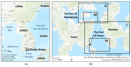 (a) Location of the study areas; (b) the study areas enlarged from (a): area I includes the Port of Yeosu and City of Namhae, area II includes Myo Island and Cities of Gwangyang, Namhae, and Yeosu, area III includes Myo Island and City of Yeosu, and area IV includes the Port of Yeosu and Cities of Yeosu and Namhae.