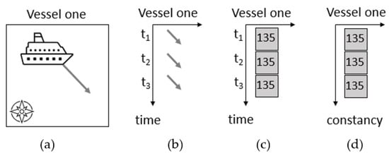 Example concepts of the REMO approach for vessels following [43]: (a) a vessel moves toward the south with a constant motion azimuth; (b) the constant motion azimuth occurs per time unit; (c) values of the motion azimuth, 135°, are coded per time unit; (d) the vessel’s movement shows a constancy of motion azimuth.