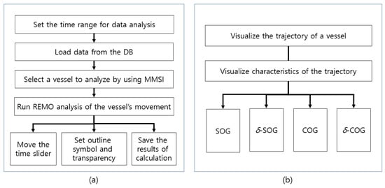 A list of the vessels’ Maritime Mobile Service Identity (MMSIs) from the database is displayed on the left-hand side of the UI. When the user selects a vessel, the vessel’s trajectory is displayed in a different color from other vessels’ trajectories on the digital chart. The user can display changes in the selected vessel’s trajectory per time by using a time slider at the bottom of the UI. The user can select SOG, COG, δ-SOC (or change of SOC), and δ-COG (or change of COG) in the UI to visualize the analysis results. SOG and δ-SOG refer to information about the vessel’s velocity, and COG and δ-COG refer to information about the vessel’s course. Usually, AIS data include information on the heading of a vessel and its rate of turning (ROT). However, AIS data were not used to analyze the vessels’ trajectories in this study because the ROT values represent the intention of a vessel’s navigation rather than the results of its navigation. Finally, the user can select one of the analysis results from V-REMO and adjust its graphic symbology, such as the outline and transparency, to enhance the display. Figure 4 shows the process of the REMO analysis of a vessel’s movement (Figure 4a) and the visualization of the results (Figure 4b) in V-REMO.