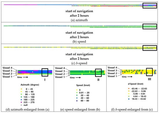 Figure 6 presents the initial results of the REMO analysis regarding the azimuth (Figure 6a), speed (Figure 6b), and δ-speed (Figure 6c) of vessels 1, 2, 3, and 4 in REMO matrices. The four rows in each REMO matrix in Figure 6 visualize the relative movements of the corresponding vessels. Since the four vessels started their navigation at different times, the starting time of their navigation and the lengths of their data in the REMO matrices are not identical. Figure 6d–f show a part of the REMO matrices enlarged from Figure 6a–c, respectively. In general, the motion azimuth of the vessels shows a variety of their moving directions (“divergence” in [19]) during the navigation (Figure 6a). Some vessels changed their directions (the color hue of a row changes in Figure 6d (“turn” in [19])), while others did not (the same color hue continues to appear in the row in Figure 6d (“independence” in [19])). Blank cells represent no data, since some vessels often had no difference of azimuth. Sometimes, vessels’ movements that are not clear in the azimuth matrix (Figure 6d) become more explicit in the speed matrix (Figure 6e) or the δ-speed (Figure 6f). For instance, area I in Figure 6d does not show any changes in the azimuth of the vessels. However, area II in Figure 6e and area III in Figure 6f show variations in the speed and δ-speed for the same data as Figure 6d, respectively.
