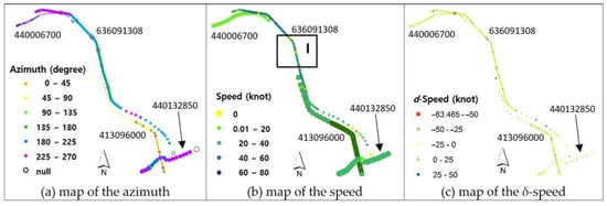 Figure 7 spatially visualizes the REMO analysis results of the four vessels in terms of azimuth (a), speed (b), and δ-speed (c) during the whole navigation. Figure 7a shows the relative azimuth of each vessel at its location. In Figure 7a, yellow-green, green, or blue colors indicate a substantial change in azimuth, and yellow, orange, or purple colors indicate a small change in azimuth. The color hues in Figure 7a change where the azimuth of each vessel changes during their navigation. Figure 7b shows the relative speed of each vessel at its location. The relative speed of the data clearly shows that the speed of the vessel “MMSI: 636091308” changed, although its azimuth was maintained while navigating in area I in Figure 7b. Finally, Figure 7c shows the relative δ-speed of each vessel at its location. The relative δ-speed, or change of the speed, of the data visualizes an increase (in green or blue color hue) or a decrease (in red or orange color hue) in the speed of each vessel while navigating (Figure 7c).
