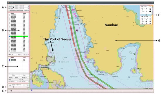 The UI of V-REMO showing area I in Figure 1b: (A) the vessels’ empirical AIS data are loaded from a trajectory database, and the time range for a query is set; (B) vessels in the database are selected; (C) vessels to be analyzed are selected, and visualization attributes are set; (D) the playback of trajectory data is controlled; (E) the slider bar is controlled; (F) the symbols of the vessels are displayed in the legend; and (G) the electronic navigational chart is shown in the chart view.