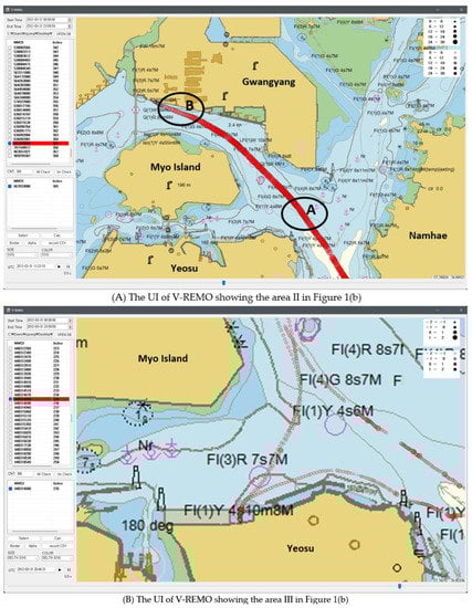This section describes the development process of V-REMO, a prototype software tool for marine traffic. V-REMO was developed by the project team at KRISO to analyze multiple vessels’ real-time movements from the decoded AIS data. The tool provides information for safe navigation based on the Microsoft NET framework. The tool aims to help the decision-making process of vessel traffic control officers and reduce their workload. V-REMO consists of a menu pane and a chart view pane to visualize analysis results on digital charts. The digital chart is displayed as the background on the chart view pane because such charts are familiar to navigation officers and controllers, and they know how to use them. The digital chart provides data on topics such as the fairway, aid to navigation, and the water depth, so that information affecting a vessel’s navigation can be grasped. The digital chart is displayed as raster data on the user interface (UI) of V-REMO to shorten the data loading time.