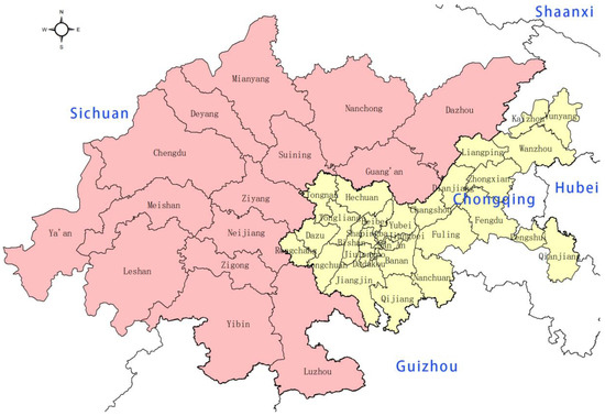The planning area of the Chengdu–Chongqing Economic Circle includes the central city of Chongqing and 27 districts (counties), including Wanzhou, Fuling, Qijiang, Dazu, Qianjiang, Changshou, Jiangjin, Hechuan, Yongchuan, Nanchang, Bishan, Tongliang, Tongnan, Rongchang, Liangping, Fengdu, Dianjiang, Zhongxian and parts of Kaizhou and Yunyang, and 15 cities in Sichuan Province, namely, Chengdu, Zigong, Luzhou, Deyang, Mianyang (except Pingwu County and Beichuan County), Suining, Neijiang, Leshan, Nanchong, Meishan, Yibin, Guang’an, Dazhou (except Wanyuan City), Ya’an (except Tianquan County, Boxing County) and Ziyang [23]. The yellow patches in Figure 1 correspond to the Chongqing part of the Chengdu–Chongqing Economic Circle, the red patches correspond to the Sichuan part, the corresponding province names are marked in blue, and the cities and regions within the Chengdu–Chongqing Economic Circle are in black. The 44 cities or counties in the planning area are referred to below as administrative units.