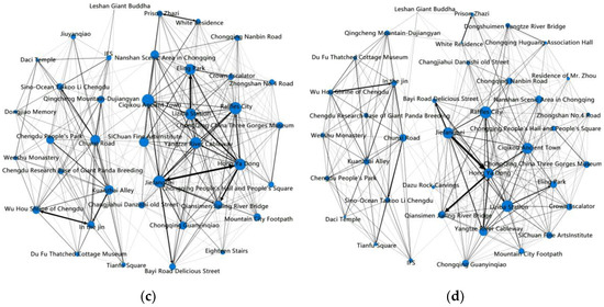 (a) Tourism flow network diagram 2018; (b) tourism flow network diagram 2019; (c) tourism flow network diagram 2020; (d) tourism flow network diagram 2021.