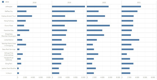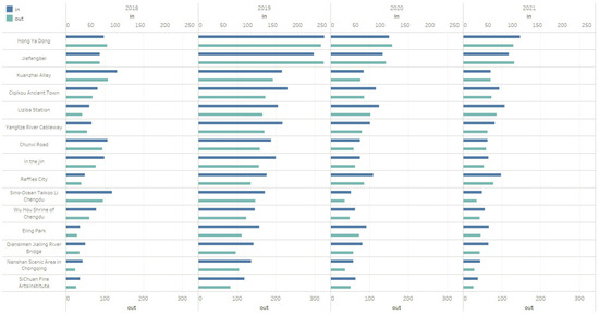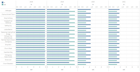 By calculation, betweenness centrality from 2018 to 2021 was ranked in the top 20 scenic areas, which were Jiefangbei, Ciqikou Ancient Town, Kuanzhai Alley, Raffles City, Nanshan Scenic Area in Chongqing, Hong Ya Dong, Chunxi Road, Sichuan Fine Arts Institute, Liziba Station and Yangtze River Cableway, which have a high degree of control over the tourism flow network, with most tourism flows using these scenic spots as a transit to other scenic areas.