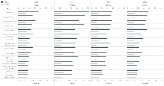 The larger the effective size of a structural hole, the stronger its ability to bridge other scenic spots in the tourism flow network that are not directly connected. The results of the effective size and constraint of the structural hole calculation for each node in the Chengdu–Chongqing Economic Circle tourism flow network are shown in Figure 8. For the sake of aesthetics and readability of the figure, Figure 8 only shows the top 15 nodes in terms of the effective size of the structural hole in the four years.