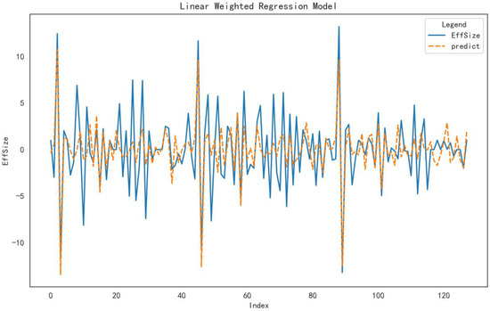 Figure 9 shows the fitting effect of the linear regression model. As shown in the legend, the solid blue line indicates the actual effective size of the structure hole, and the dashed orange line indicates the predicted effective size of the structure hole by the regression model. The detailed parameters of the regression model are shown in Table 3. x1 corresponds to road density, x2 to the number of star-rated hotels, x3 to the number of scenic spots and x4 to the value of regional GDP per capita. The corrected R2 value is 0.514; combined with the trend line in Figure 9, the model fits well. t is used to measure the significance of the coefficient statistics, and P > |t| less than 0.05 indicates a significant association between the independent and dependent variables. The indicators of the degree [0.025, 0.975] are the lower and upper limits of the 95% confidence interval.
