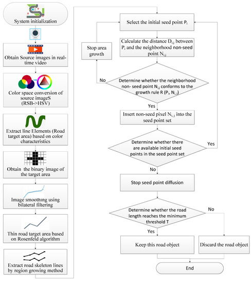 - Refinement based on the Rosenfeld algorithm [38] for the road target area is performed to complete the road target skeleton line generation preparation.