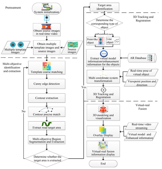 ARMap V2.0 system mainly includes an identification and extraction module of unmarked map elements, an augmented information acquisition module, a 3D tracking and registration module, and a 3D modeling and virtual–real fusion display module. The identification and extraction module of unmarked map elements can effectively extract point-like and line map elements and then accurately identify map elements in real-time. Through the identified map elements, the 3D tracking and registration module is used to realize the unmarked tracking and registration of planar map element images. The 3D modeling and virtual–real fusion display module is used to build 3D models and obtain augmented information so as to achieve a more accurate virtual–real fusion effect.