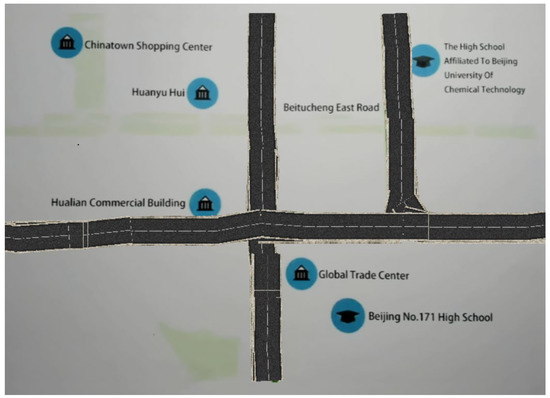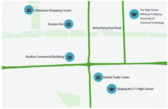 Figure 9 shows the effect of virtual fusion of point-like elements, in which there are two types of point-like elements, representing “commercial building” and “educational institution.” The virtual model is automatically identified and extracted by the ARMap V2.0 system, and the fusion of virtual model and point-like elements is realized.
