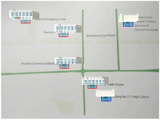 The effect of virtual–real fusion of point-like elements (The red box represents the commercial building, and the blue box represents the educational institution. The occlusion of the text in Figure 9 verifies the principle of virtual-real fusion).