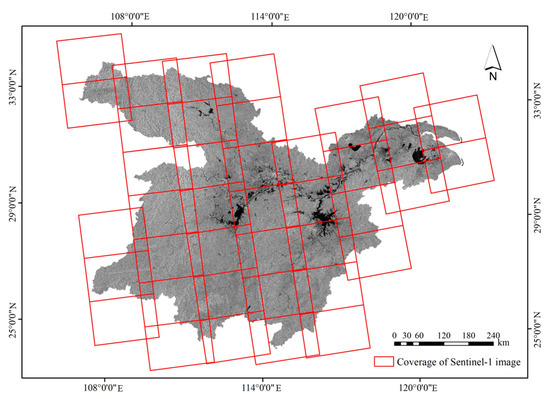 We used 320 Sentinel-1 images stored in the GEE cloud service with an imaging time from 16 June 2020 to 8 September 2020 to cover the entire flood stage. Five floods occurred in the Yangtze River basin in 2020, on 2 July, 12 July, 26 July, 14 August, and 17 August. We chose images after 16 June that could cover the study area before flooding, and images before 8 September to cover the study area after flooding. The image coverage is shown in Figure 2. The preprocessing operations of Sentinel-1 data on the GEE platform include thermal noise removal, radiometric calibration, and terrain correction [30]. Additionally, we performed mean filtering on the Sentinel-1 data, using the filter window size 3 × 3 for suppressing speckle noise in the image. After preprocessing, we obtained the backscattering maps with a resolution of 10 m in the study area.