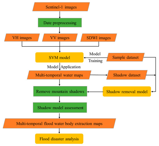 In addition, due to the uneven grayscale distribution in SAR images [18], easy confusion of water body and mountain shadows [26], and limited computing resources [24], the existing large-scale watershed flood monitoring is not very accurate. Therefore, based on the GEE cloud computing platform, in this work, we used all Sentinel-1 images during the flood disasters period in the study area, first used the SVM method to extract the flood water body information. Then, we proposed a novel function model to remove the mountain shadows from the flood maps. Finally, we post-processed the results to analyze the flood disasters in the MLB in 2020.