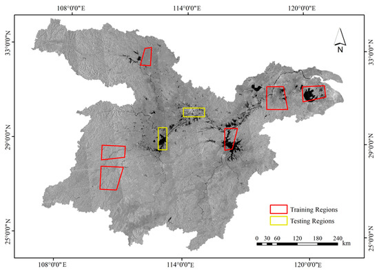 Whether the trained SVM model can make accurate predictions depends on the construction of the sample dataset, and the randomly distributed speckle noise in the SAR images [35] hinders the production of samples. In order to ensure the validity and accuracy of the sample data, the training samples and testing samples were visually interpreted from Sentinel-1 images with the aid of Sentinel-2 optical remote sensing images, where the imaging time of Sentinel-2 and Sentinel-1 images was controlled within one day, and the Sentinel-2 images were below 3% cloud cover. The study produced a total of 50,000 training samples and 20,000 testing samples, which included 14,423 water samples and 35,577 non-water samples in the training samples, and 8842 water samples and 11158 non-water samples in the testing samples. The training samples came from six geographic regions and different time images (Figure 4), thus guaranteeing the robustness and generalization of the SVM model.