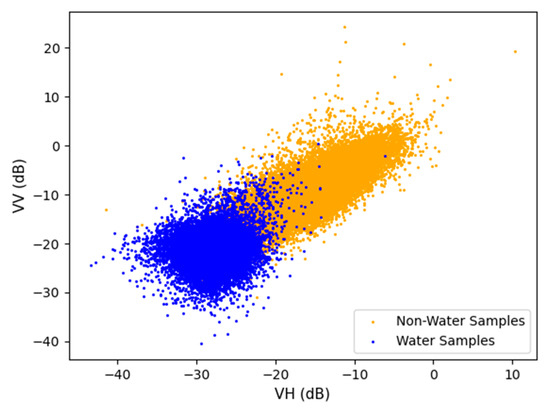 Since the training samples were difficult to classify on the two-dimensional space composed of VH and VV polarization modes (Figure 5) and considering the limited polarization data of Sentinel-1, we introduced SDWI features to enrich the data features [36]. Firstly, the SDWI features were constructed using preprocessed Sentinel-1 dual polarization data. Then, VH features, VV features, and SDWI features were combined into the three-band images. Finally, the training samples with VH–VV–SDWI feature information were input into the SVM model for training. SDWI was the SAR image water index feature proposed by Jia in 2018 [34], the formula is as follows: