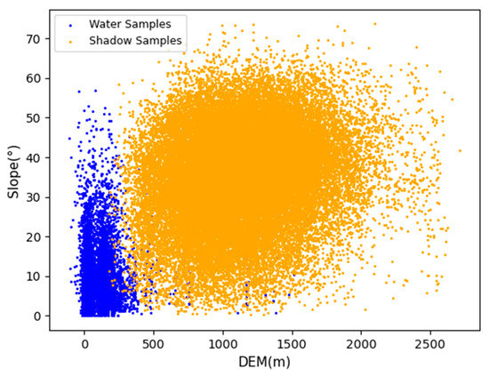 The water body and shadow samples in the two-dimensional space of elevation and slope. The number of water body and shadow samples were 23,265 and 41,214.