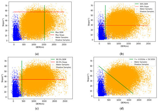 Methods 1 to 3 were threshold methods. The threshold value in method 1 was determined according to the maximum elevation and maximum slope of the water samples. If the elevation and slope at any location in the study area were both higher than the threshold value, this location was identified as mountain shadow. The maximum threshold was applied to the shadow samples, which could remove 0.706% of the shadow samples (Figure 7a). The threshold value in method 2 was determined according to the proportion of the elevation and slope values of the water samples arranged from low to high to 99%, and the shadow recognition rate reached 70.54% (Figure 7b). Similarly, the threshold value in method 3 was determined according to 99.5%, and the shadow recognition rate was 55.94% (Figure 7c). Method 4 was the function method, which was proposed according to the water sample points with the maximum elevation (DEM: 1518 m, slope: 10.3082°) and the maximum slope (DEM: 78 m, slope: 56.978°), and its shadow recognition rate was 75.46% (Figure 7d). The function model could alleviate the interference of mountain shadows without reducing the accuracy of flood monitoring. Therefore, this paper selected the linear function model proposed by method 4 to remove the mountain shadows. The formula was as follows: