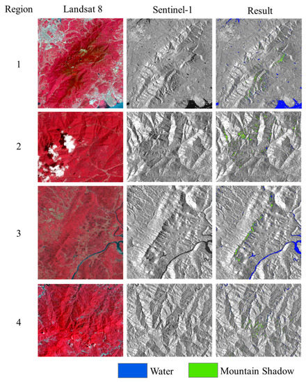 In order to qualitatively evaluate the ability of the function model to remove the mountain shadows, this paper selected four geographic areas to display the details after removing the mountain shadows, as shown in Figure 9. The left column of Figure 9 is the Landsat 8 optical remote sensing image of the four geographic regions. The middle column contains the corresponding Sentinel-1 SAR images. The right column is the result after removing the mountain shadows, in which the blue elements represented the water body after removing the mountain shadows, and the green elements represented shadows recognized by the function model. It could be seen that the shadows formed by tall mountains obscuring the radar beam were identified (region 1 and region 3), but the shadows caused by low mountains were partially identified, and some shadows were not extracted (region 2 and region 4). The results showed that the linear function model proposed in this paper had a good effect in removing the mountain shadows, and it could mitigate the interference of mountain shadows in large-scale watershed flood monitoring.