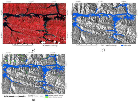 The results of removing mountain shadows in the selected region. (a) Landsat 8 image, (b) ground truth, (c) water body results.