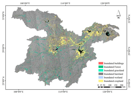In order to evaluate the losses caused by this major watershed flood, the study superimposed land use data into the water body extraction results to analyze the specific categories of land use inundated by the floods. The land use data used in the study was produced in 2020, which was consistent with the time of the research subject, so as to avoid changes in land use status due to differences in data years. As shown in Figure 11 and Table 6, a variety of land uses were affected by the basin floods, and a total of 8526 km2 of land was inundated, which was mainly distributed along the Yangtze River. Among them, cropland was the most severely affected, with an affected area of 6160 km2, accounting for 72.25% of the total inundated area, with the inundated cropland mainly distributed along the main stream of the Yangtze River and around Poyang Lake. The floods severely damaged agricultural production and caused serious losses to the MLB. Wetland and forest were more seriously affected, and their inundated areas were 985 km2 and 677 km2, respectively. The inundated wetland was mainly distributed along the Dongting Lake and Poyang Lake, and the inundated forest was mainly distributed in the west and south of the study area. Grassland, buildings, and bare land were less affected, and their inundated areas were 416 km2, 182 km2, and 106 km2, respectively, accounting for less than 5%. The inundated grassland was mainly located in the west and south of the study area, while the inundated buildings were mainly located along the Wuhan section of the Yangtze River and the Nanjing section of the Yangtze River.