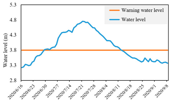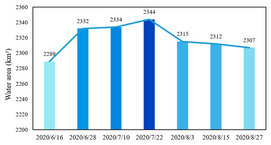 The measured water level data could supplement SAR images for flood monitoring [41]. Therefore, this paper collected daily water level data from the Dongting Xishan hydrological station located in Taihu Lake, as shown in Figure 12. It could be seen that the water level of Taihu Lake was 3.22 m on 22 June, when the water level rose rapidly at the beginning, crossing the warning water level of 3.8 m on 29 June and reaching the highest level of 4.75 m on 21 July. Then, the water level gradually decreased and dropped to the warning level on 13 August. Figure 13 and Figure 14 showed the water area changes of Taihu Lake. It could be seen that the changes of the water body area were consistent with the trend of water level changes, and its water area increased from 2289 km2 on 16 June to 2344 km2 on 22 July, which was an increase of 55 km2. Then, the water area decreased to 2307 km2 on 27 August, which was a decreased of 37 km2.