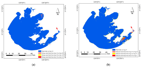 The spatial distribution maps of the water body in Taihu Lake. (a) The rising water stage, (b) the reduced water stage.